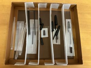 ボールペンの部品ごとに区画を分けること、部品を写真で示すこと、左から順に手に取ると完成する配置になっていること