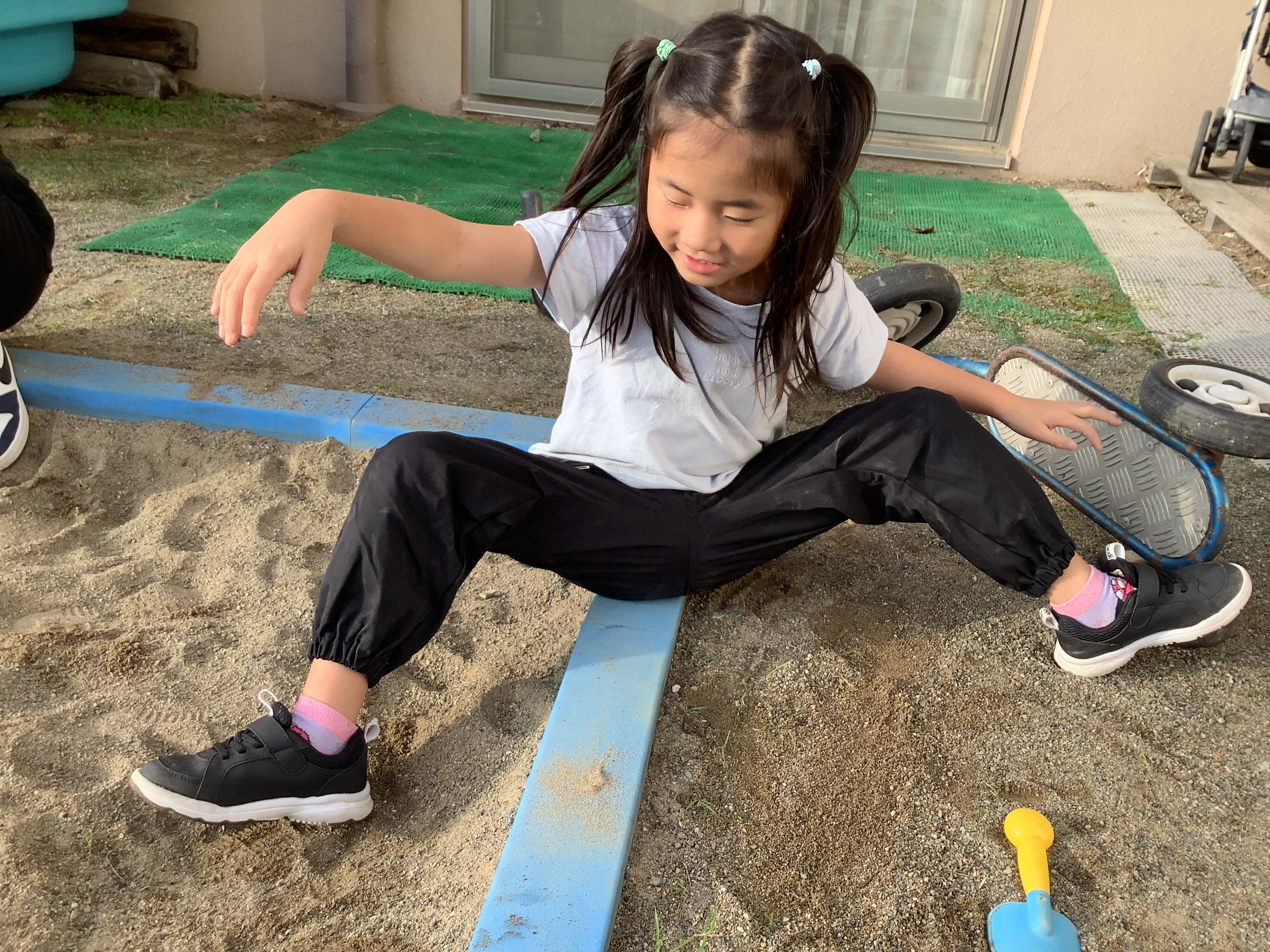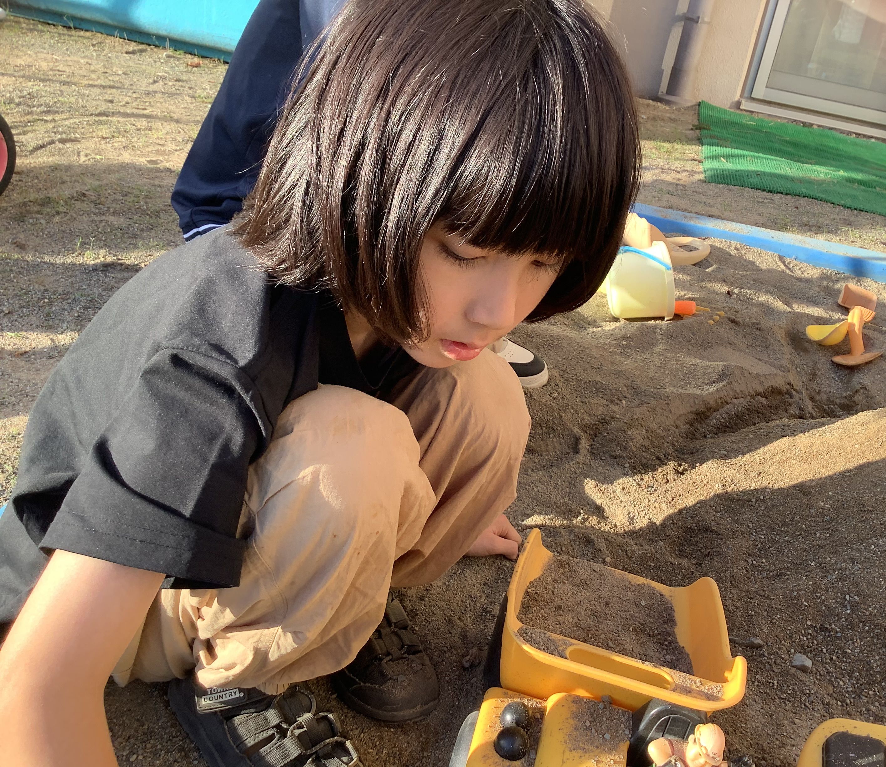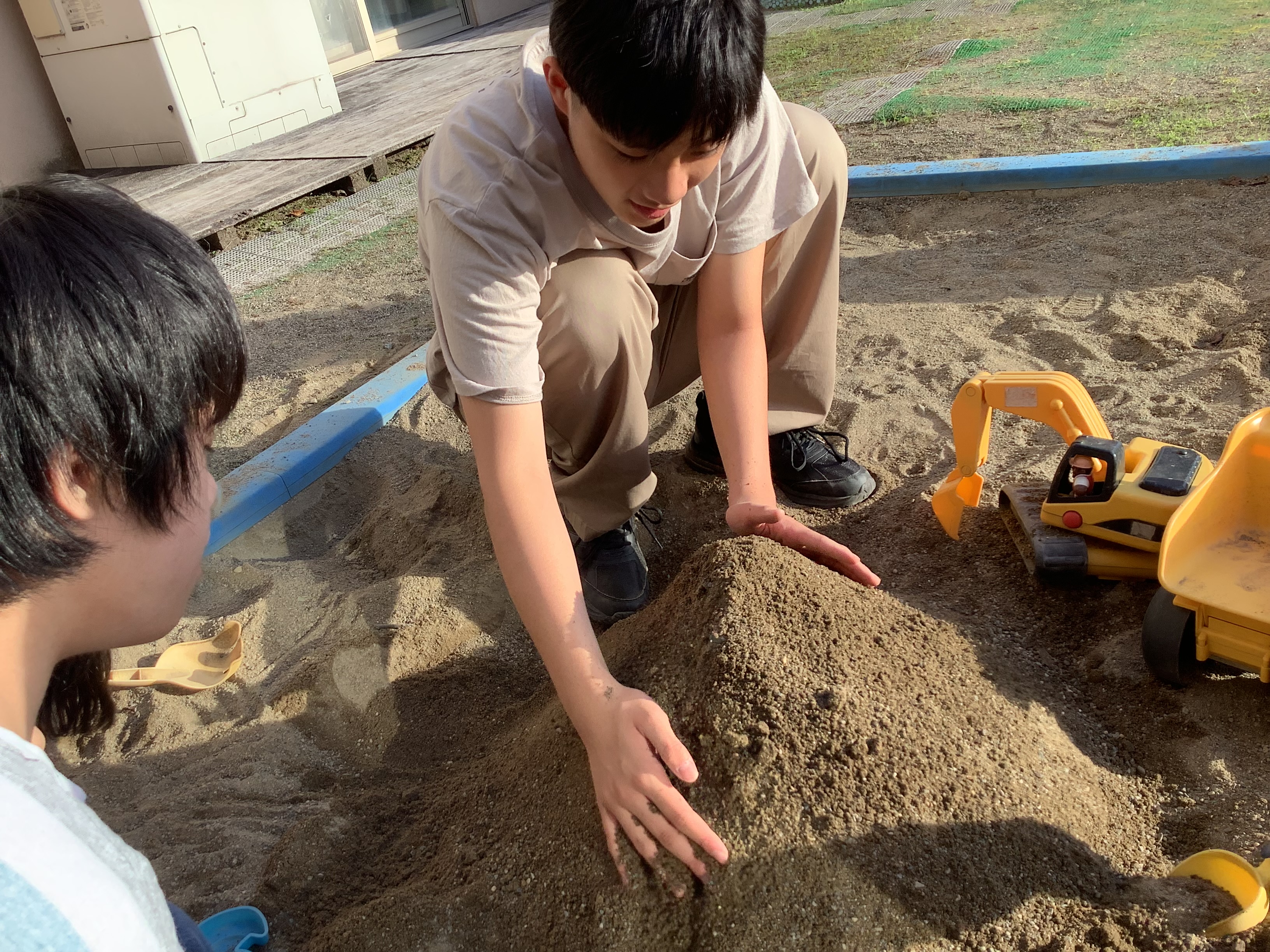 ショベルカーを使って大きい山を作ったり、砂を掴んで感覚遊びを楽しんでいます!