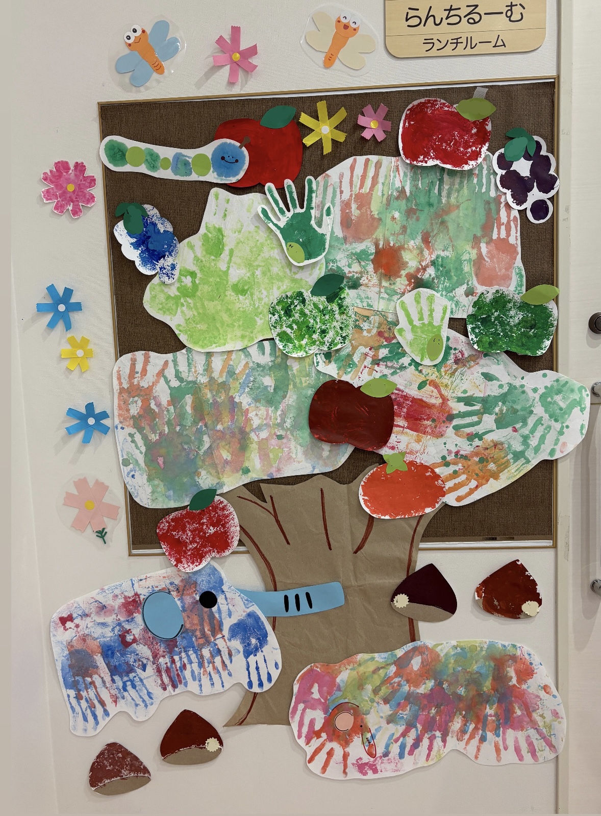 みんな思いのまま手形で自由に色をつけたり、絵の具のスタンプでポンポンと色をつけて・・・