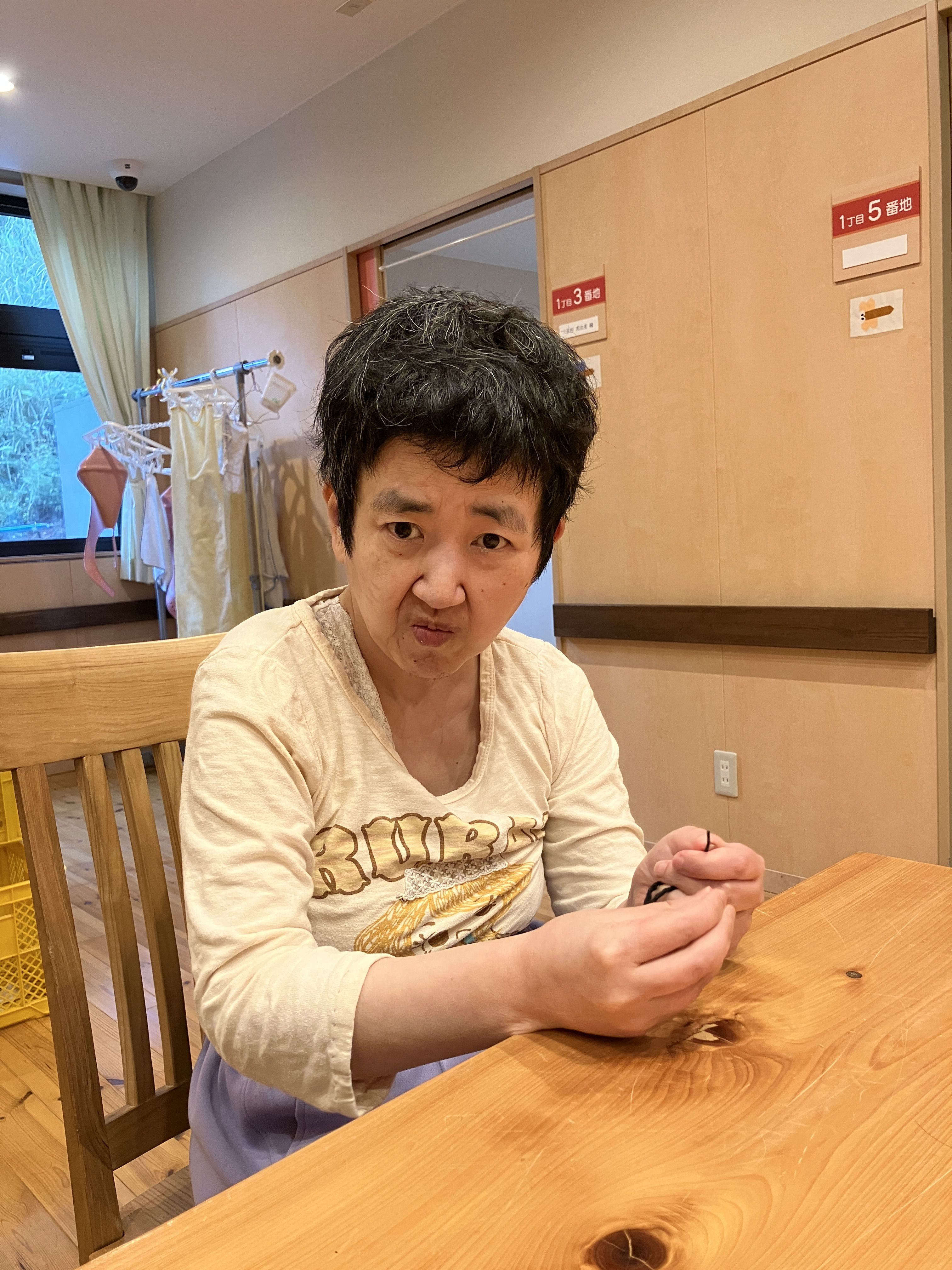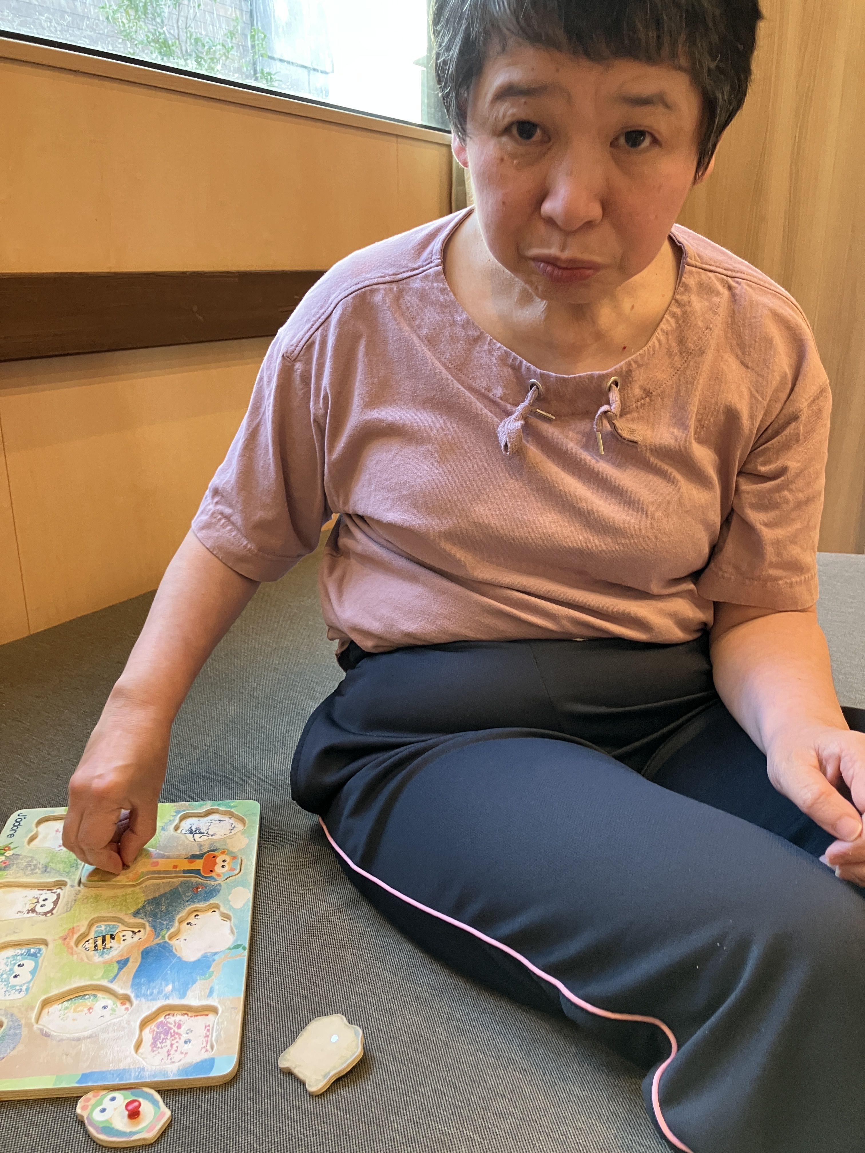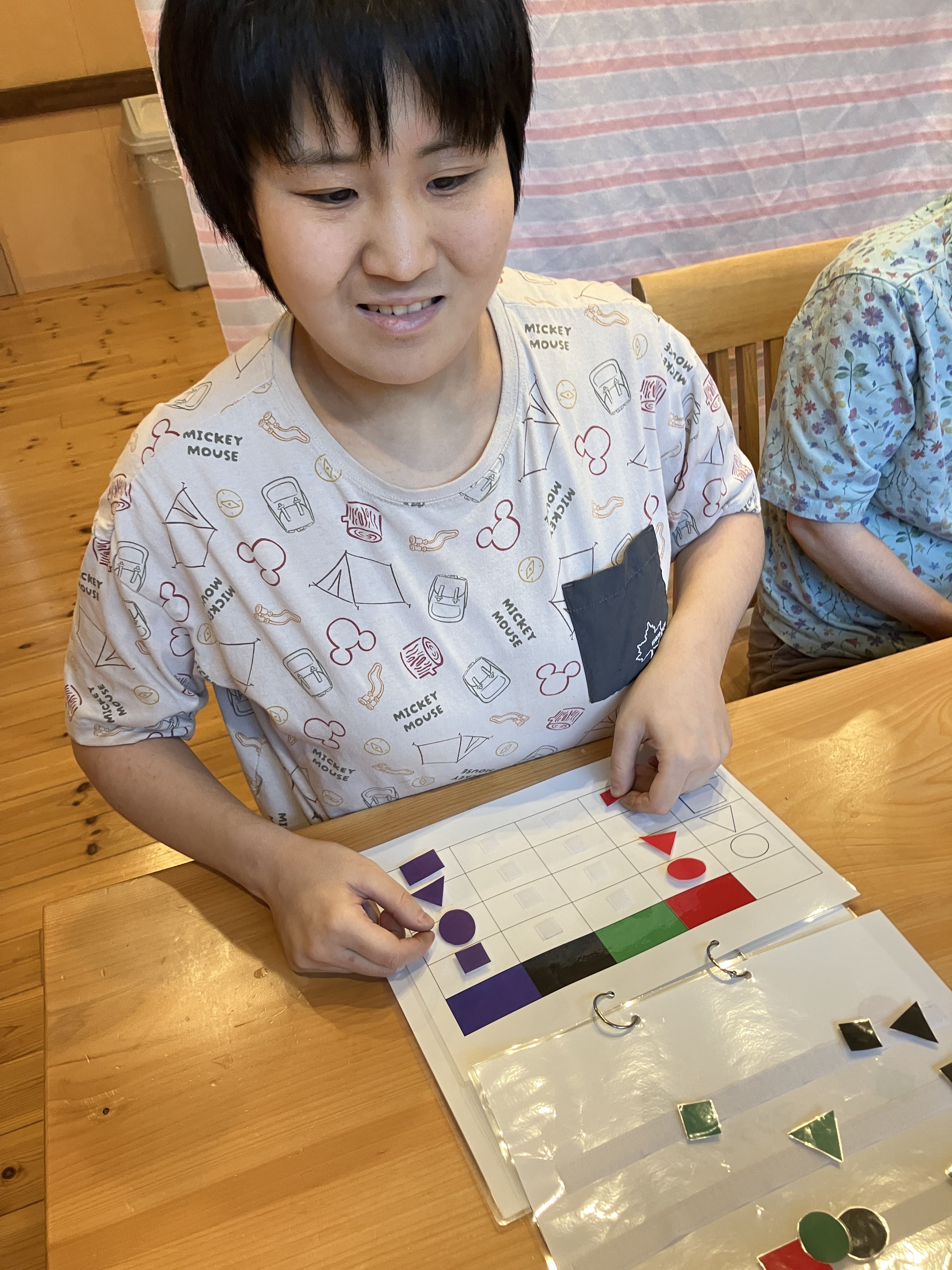 足羽更生園 2025.11.02 楓での活動 楓では、ユニット活動として、自立課題や歩行などの軽運動をしています。 自立課題では、利用者様それぞれに合わせ、型はめパズルや紐通し、マッチングなど行っています。 また主に夕方に、各自が音楽に合わせて楽しく歩行などの運動をしています。 この時は職員も一緒に歩行して、ダイエットに励んでいます(笑)