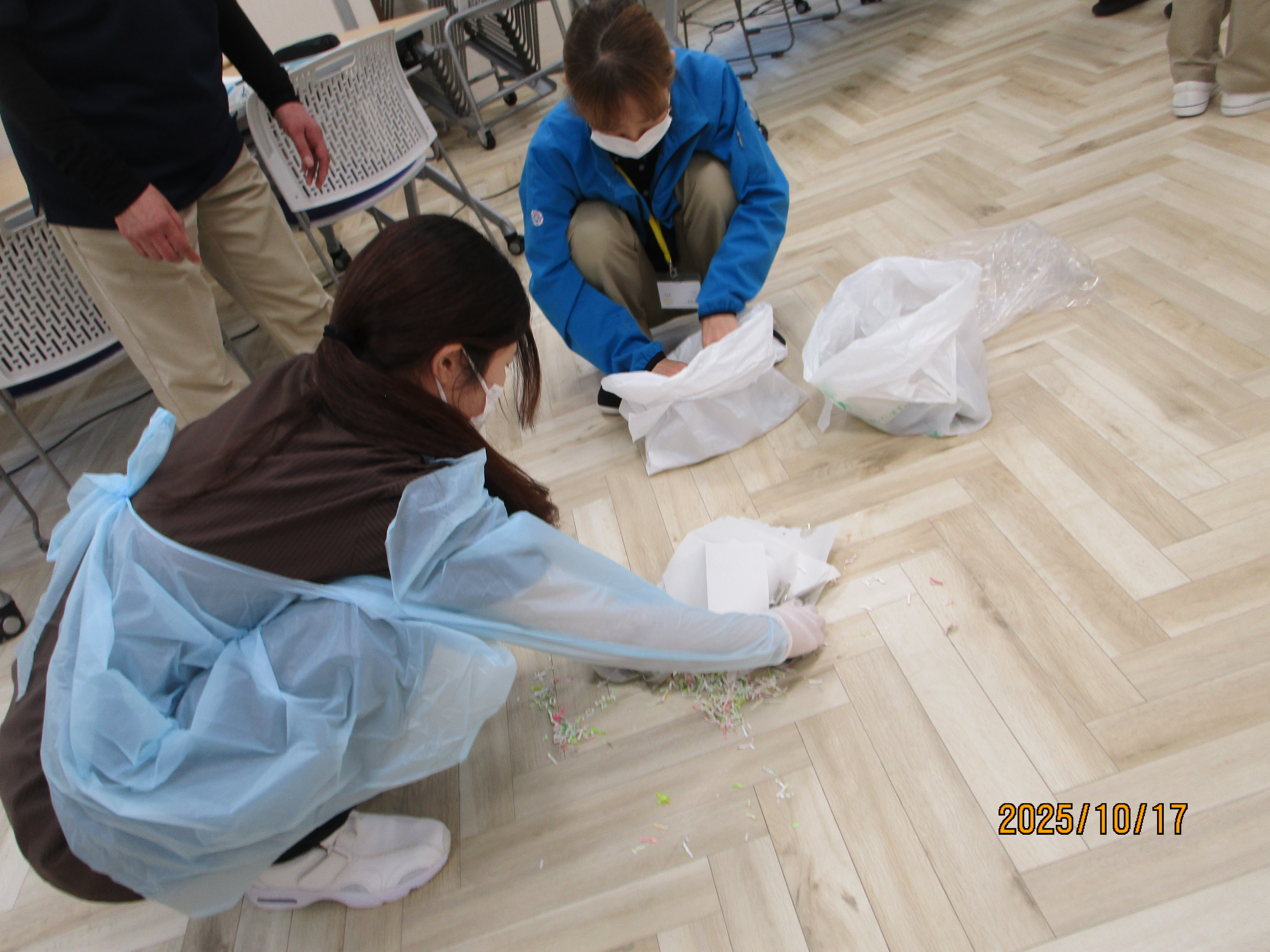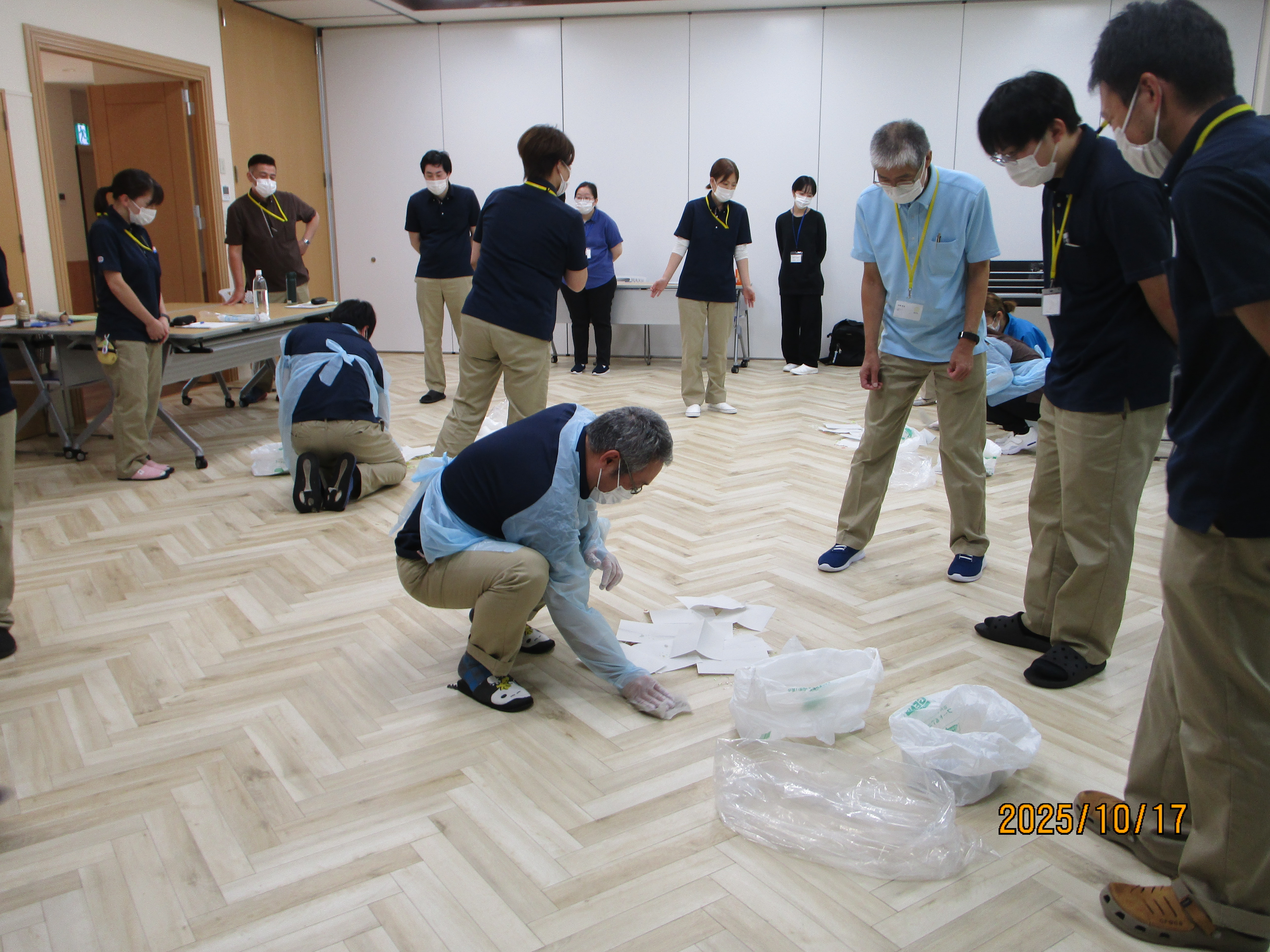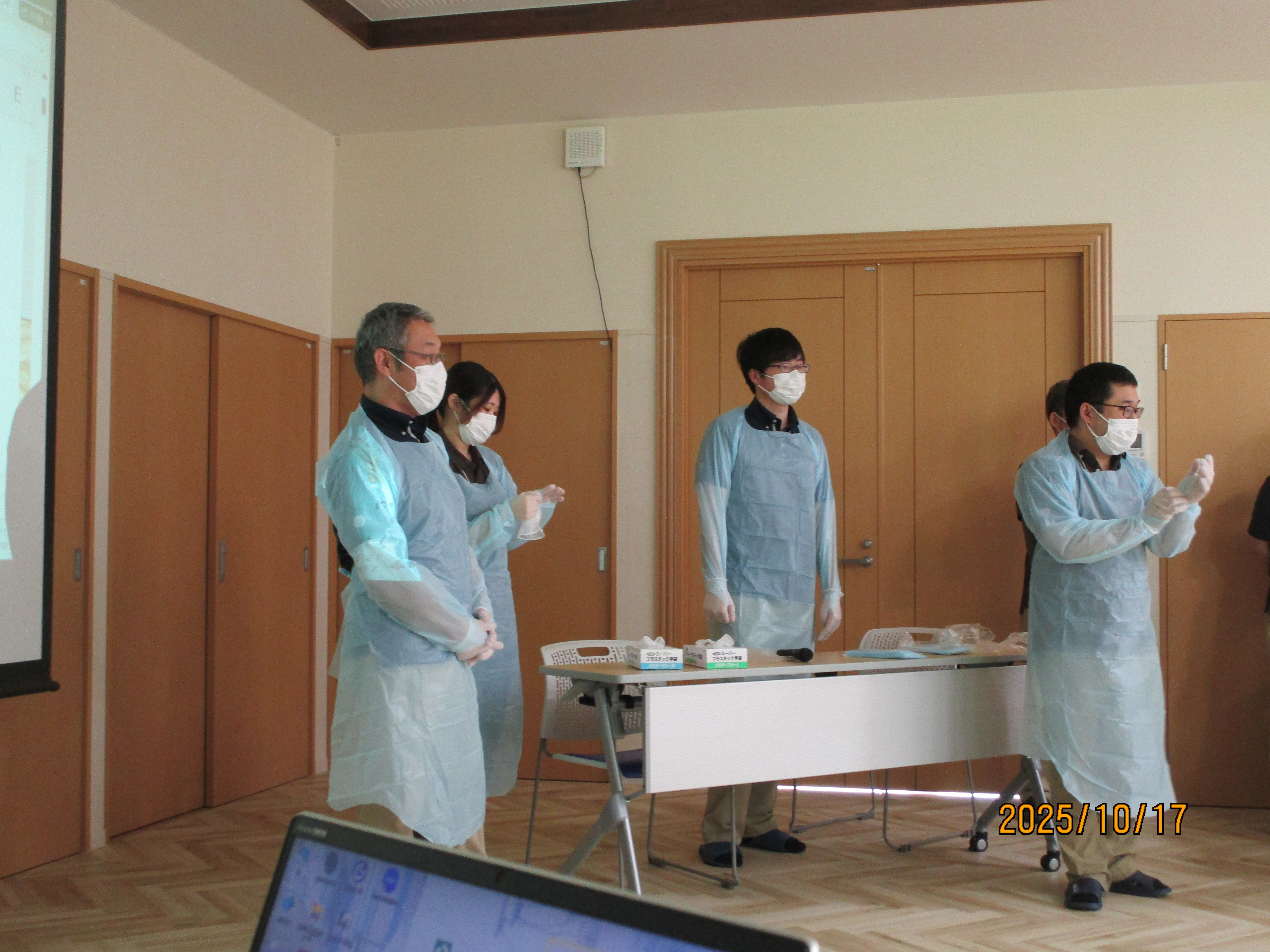 まずは、嘔吐物処理の手順を確認し、そのあとで職員同士がグループになり、防護服を着け、嘔吐物処理の流れを実際に体験しました。