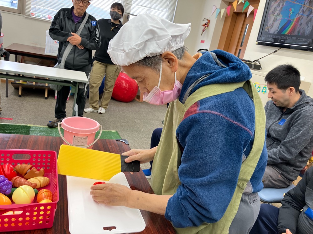 襷代わりにエプロンと帽子を付けて、おもちゃの野菜を切ります!そして次の方へバトンタッチです 😉