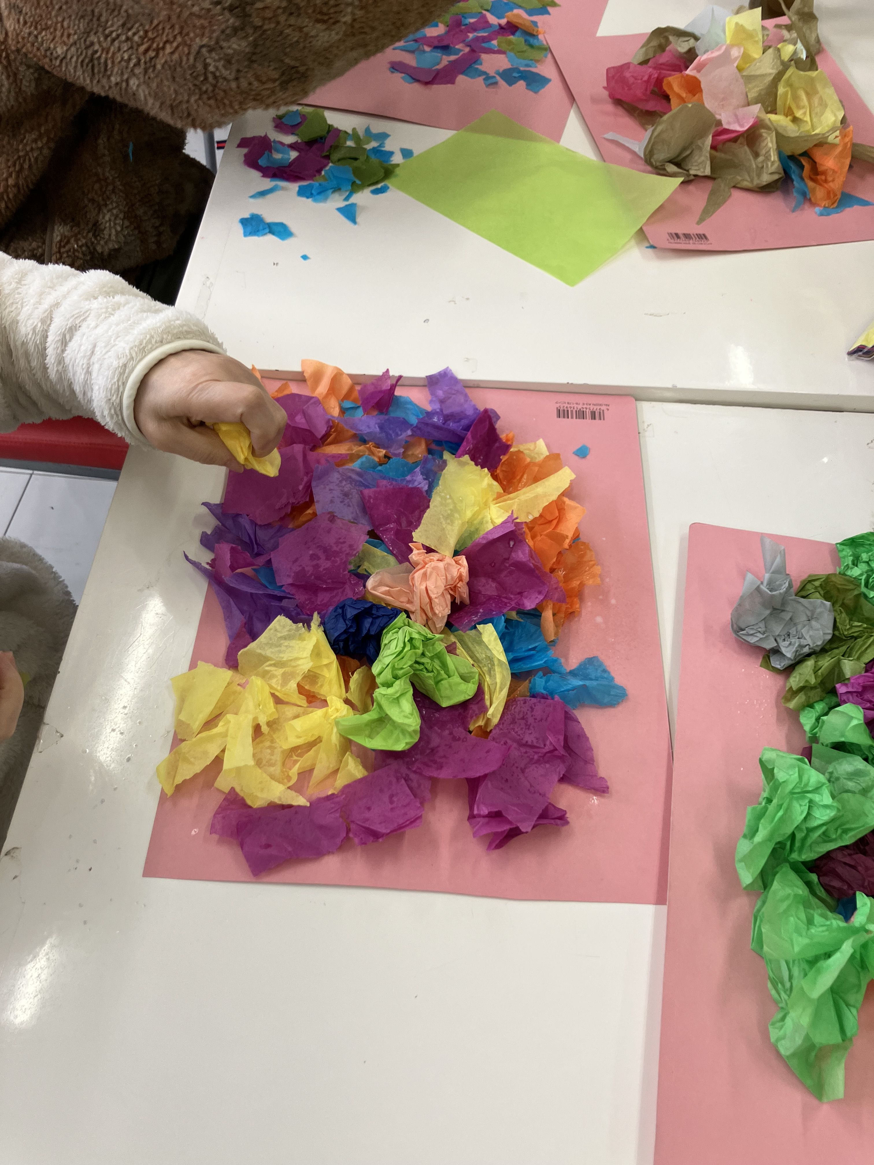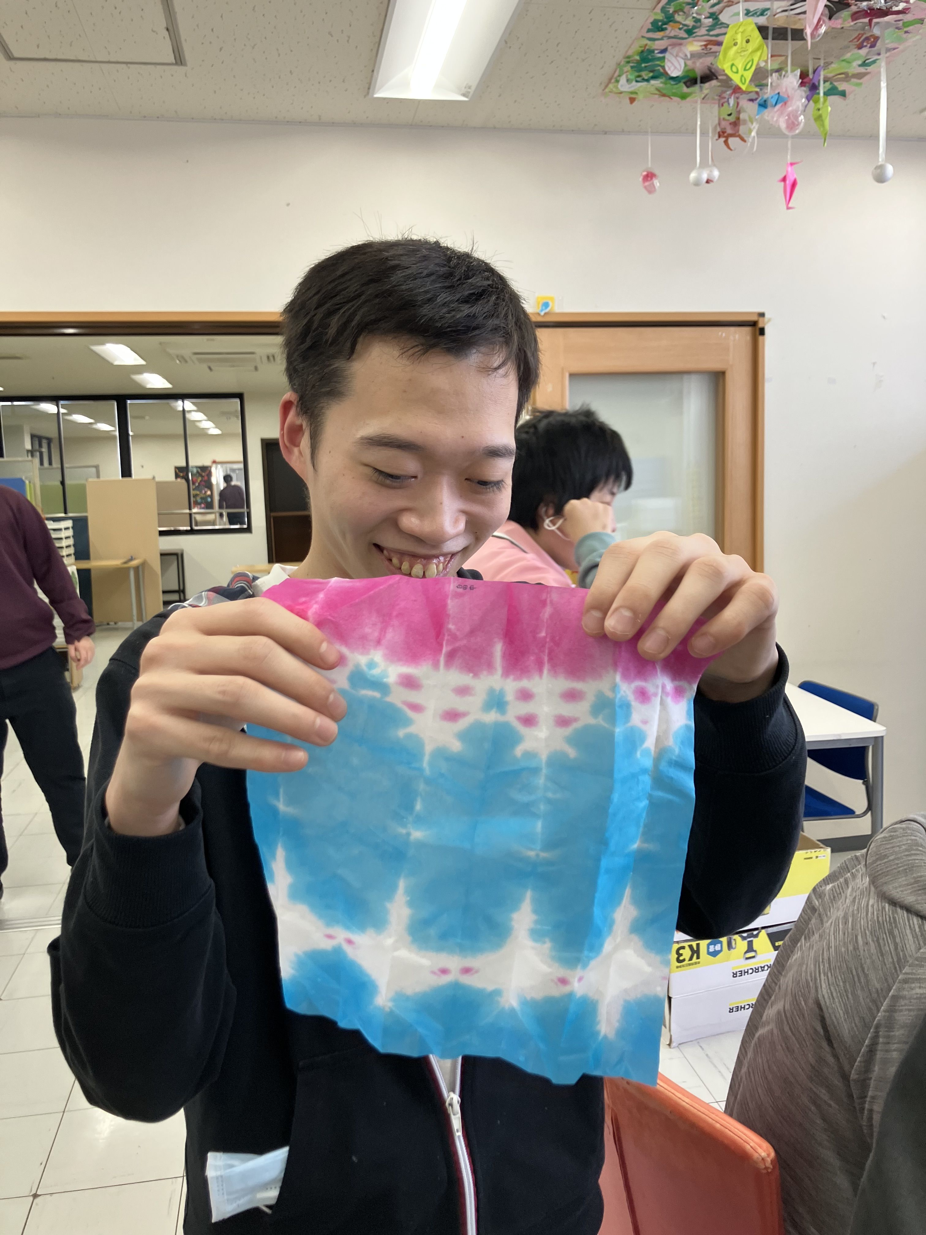 スマイル 2025.12.12 スマイルの余暇活動♪ 11/22の土曜日の活動で、装飾活動を行いました。 和紙の折染めと色紙アートを行いました。 和紙を折って、染料を付けて、カラフルな模様の和紙を作ったり、お花を作る柔らかい紙を台紙に好きなように貼付けて作品にしました。 また、いろいろな余暇を楽しみましょう! 以上、スマイルでした。