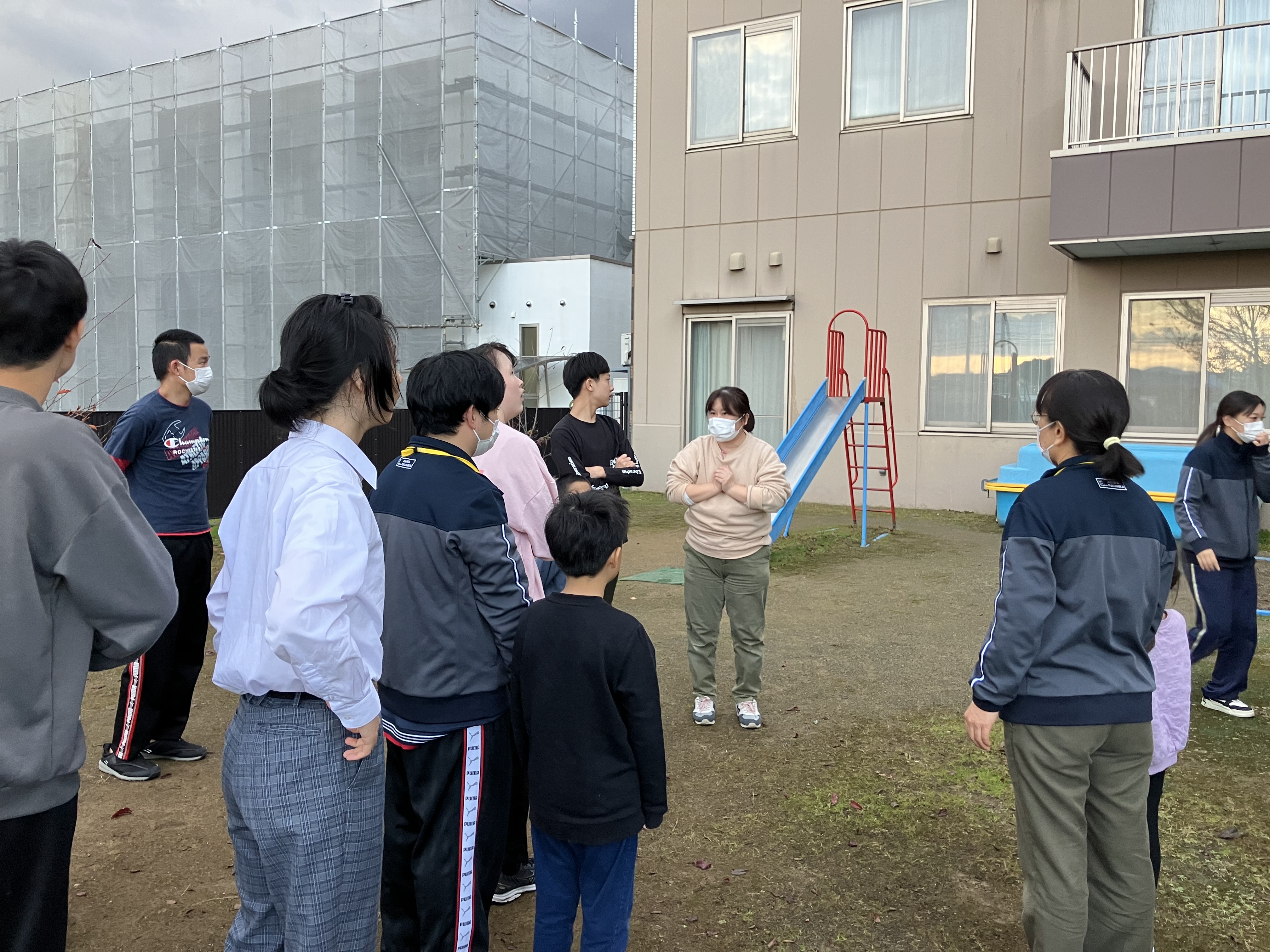 職員から「外へ避難しましょう!」との判断でみんなで園庭へ移動 ~