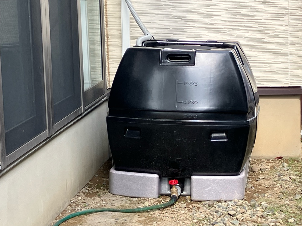 雨水タンクを設置し、花の水やりなどに使用しています。