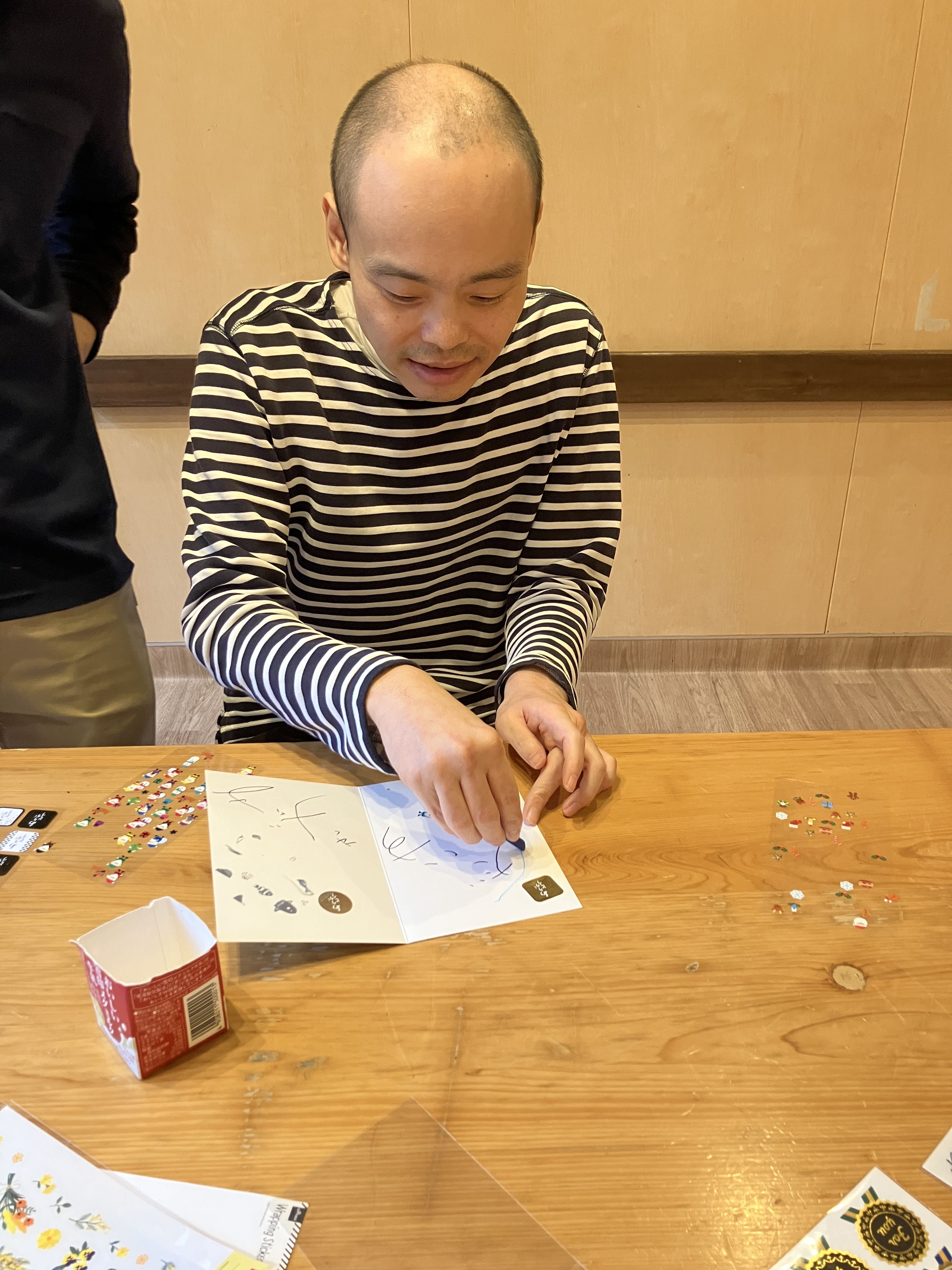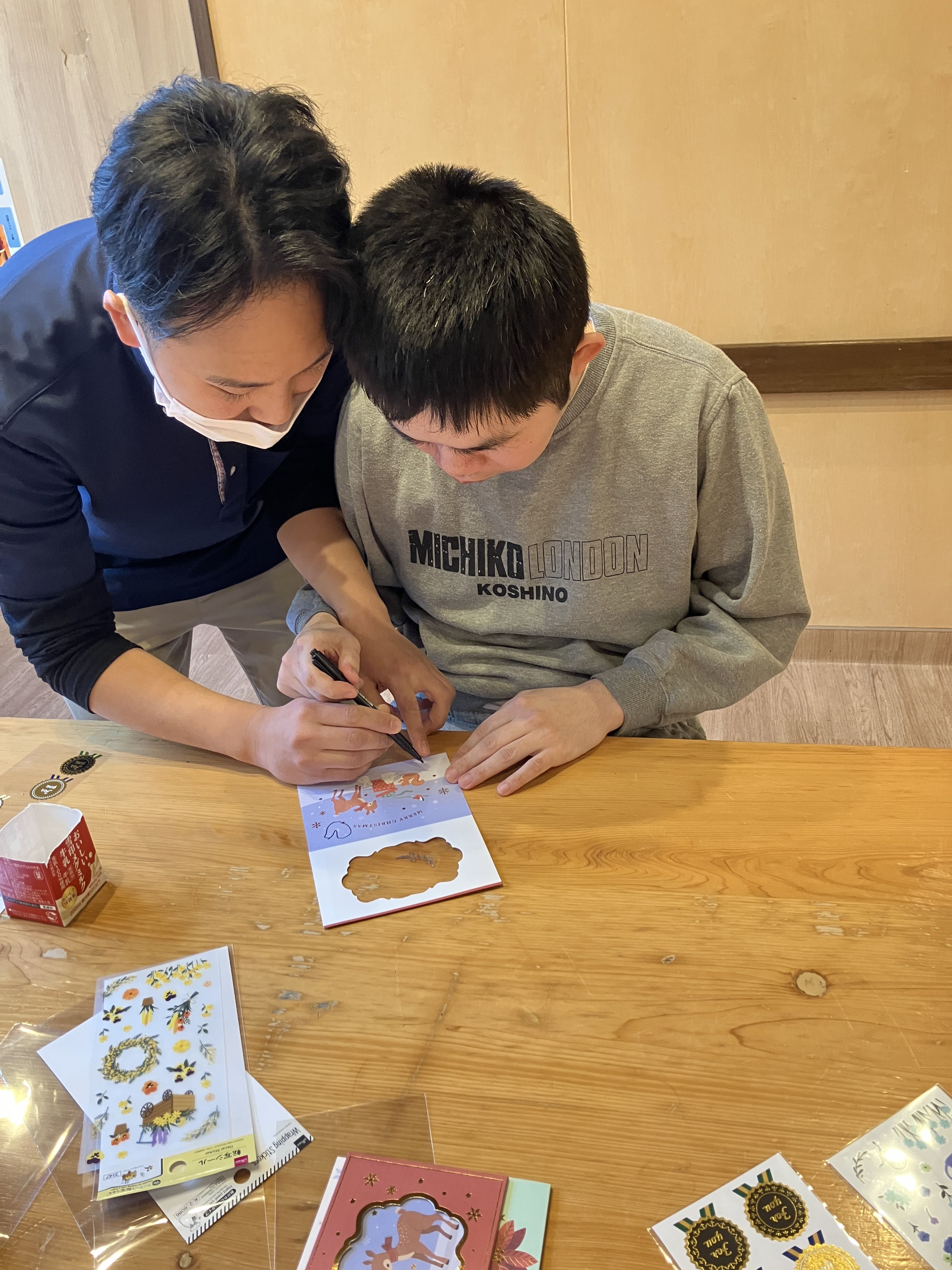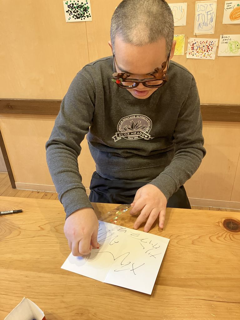 足羽更生園 2026.01.20 クリスマスカード作ったよ 12月の欅寮の寮行事ではご家族へ送るクリスマスカードを作りました!! ご家族へプレゼントすることを伝えると、皆さん張りきった勢いで文字を書いたり、シールを貼ったりしてデコレーションされました!🌟 愛情込めて作ったクリスマスカード、喜んでくれるといいなぁ、、💕