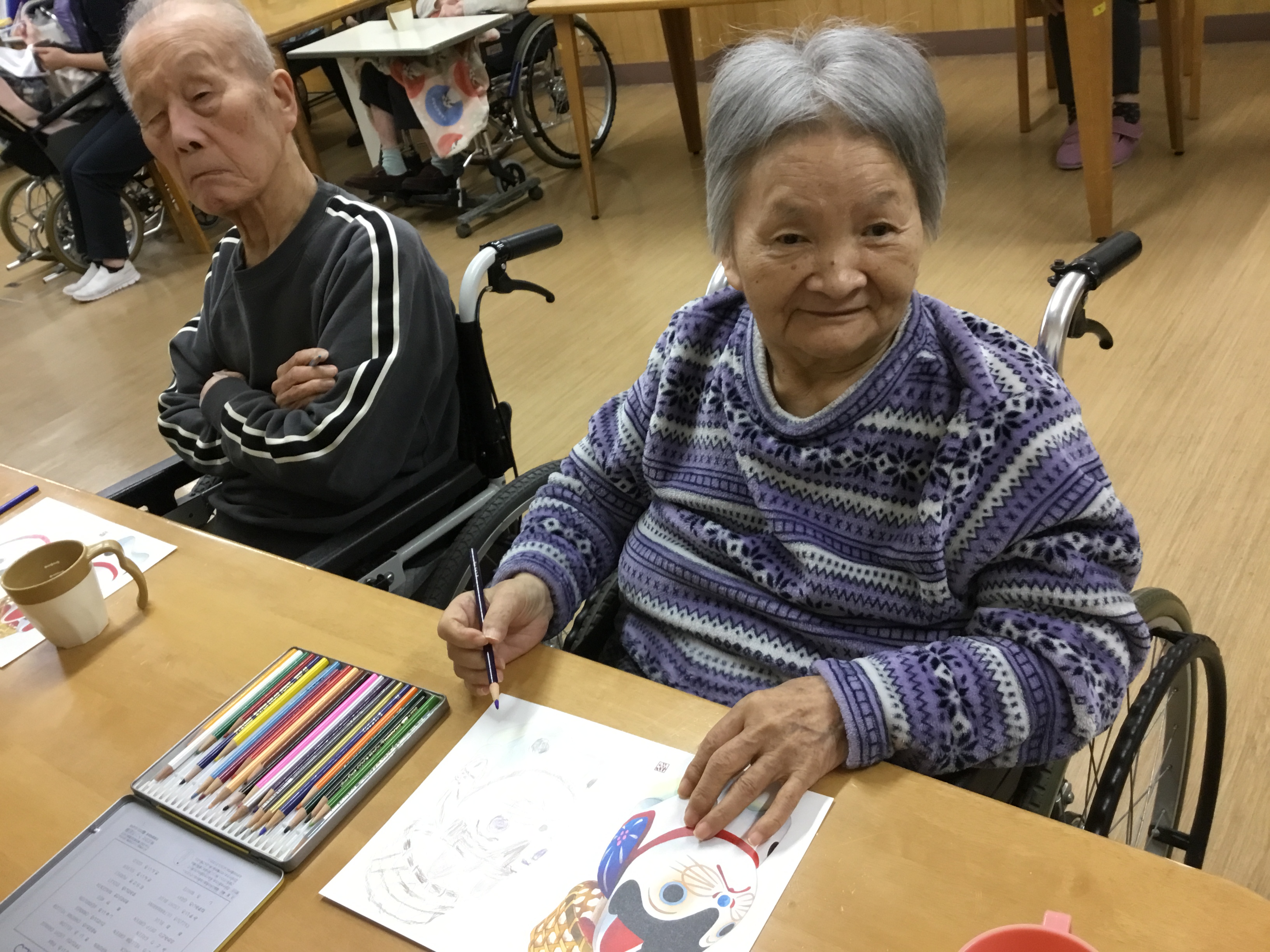 塗り絵がお好きな方も苦手な方も、お手本を見ながら、上手に塗ってくださっています。