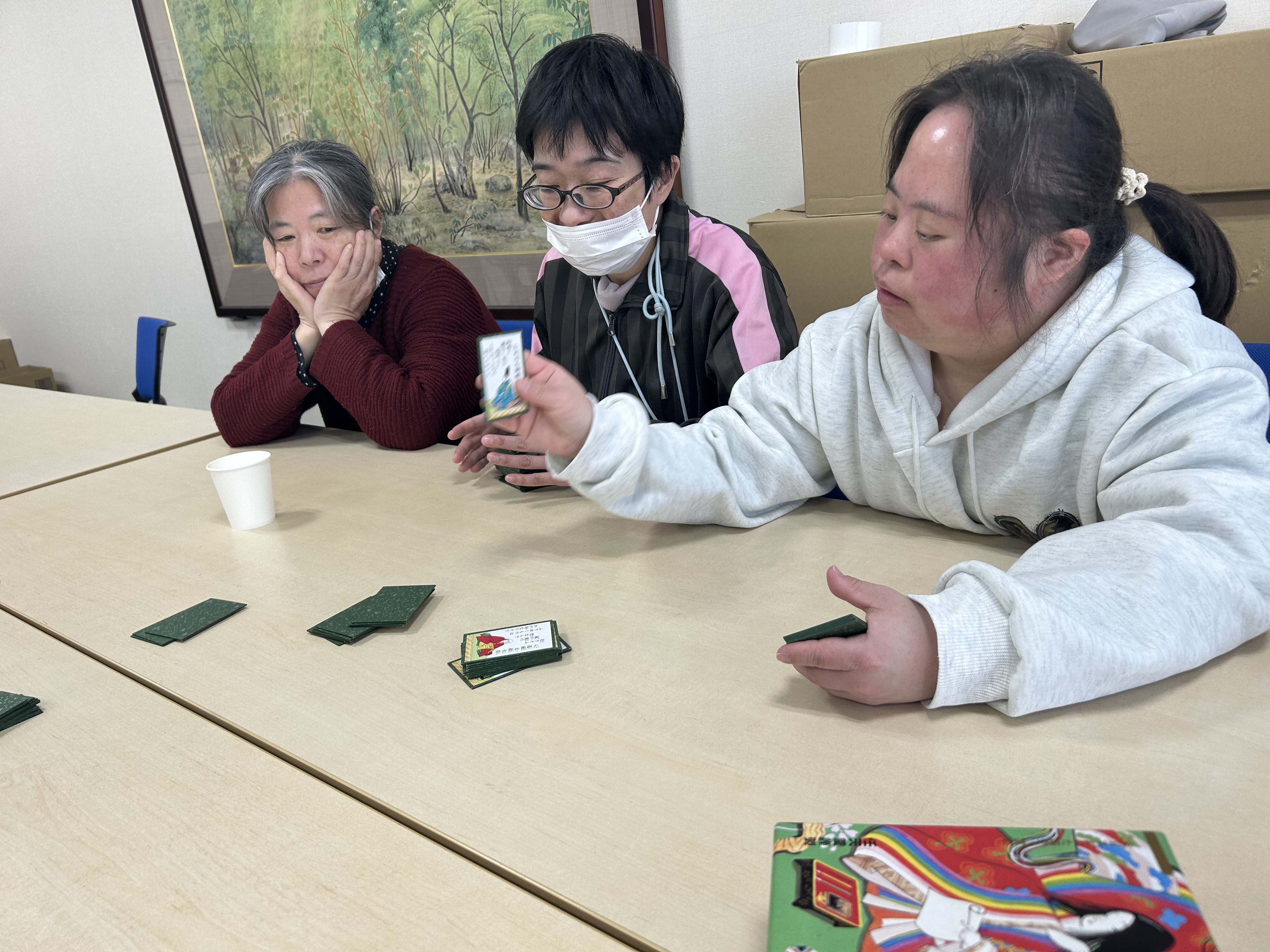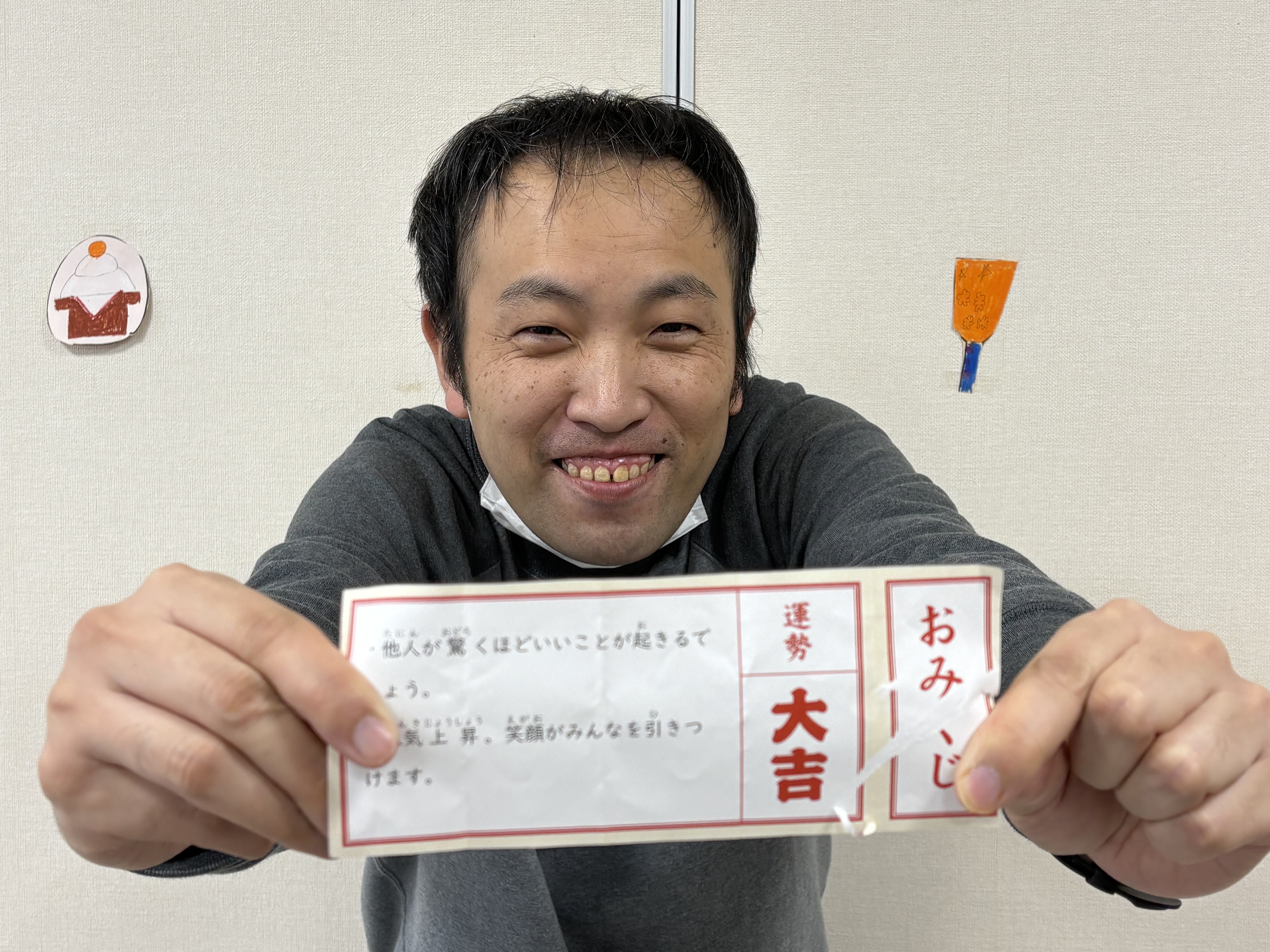 足羽ワークセンター 2026.02.12 盛り上がった新年会! こんにちは!足羽ワークセンターです。 今回は1月レクリエーションの新年会の様子をご紹介します。 新年会では、人間すごろく・坊主めくり・福笑いのゲームを行い、最後におみくじを引き 今年の抱負を書きました。 人間すごろくでは、大きなサイコロとマスにみなさんワクワクしていました!止まったお 題に笑顔で答え、利用者様同士で笑い合っている様子が見られました。 坊主めくりでは、坊主が出たら大爆笑( ´∀` ) とても盛り上がりました! 福笑いでは、利用者様同士でパーツを渡しあったり、完成品を見て笑いあったりしておら れました( ´∀` ) とても楽しい新年会になりました!