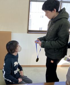 おやつを食べ終えた後は、事前に用意していたメダルのプレゼント🏅子どもたちからお父さんお母さんに!