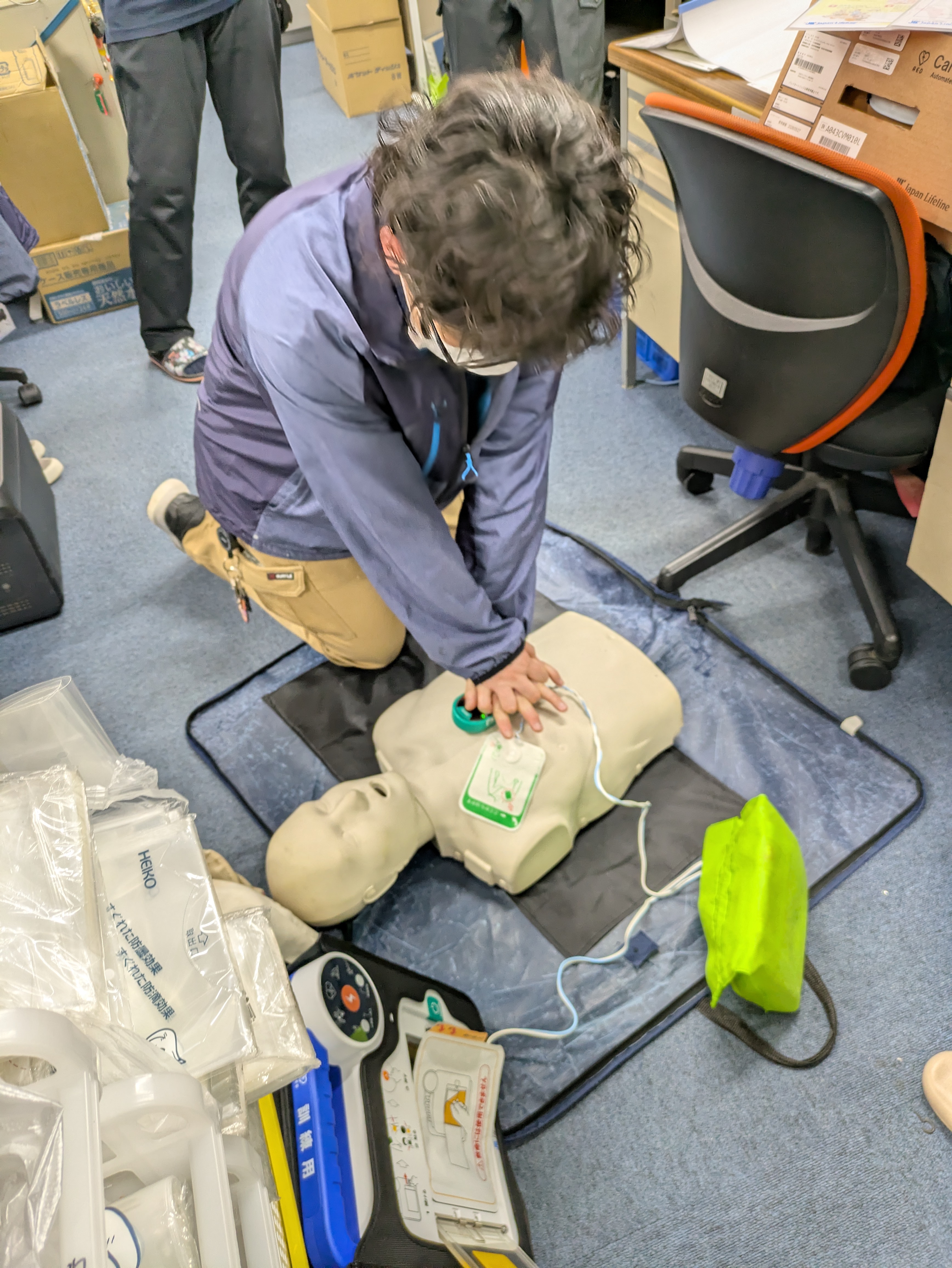 今回の講習では、AEDの使い方はもちろんですが、胸骨圧迫(心臓マッサージ)の大切さについても学び、胸骨圧迫の強さやスピードの適切さを計測する器具を用いて実技を行いました。 過去に救命の講習を受けた方も、自分の胸骨圧迫が、適切な強さ、タイミングで行われているか、計測したことはなかったので、参加者全員計測していただきました。